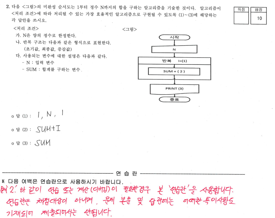 알고리즘 과목 중 순서도 문제에서는 상단 이미지처럼 순서도가 주어지고 빈칸에 알맞은 답을 적습니다.