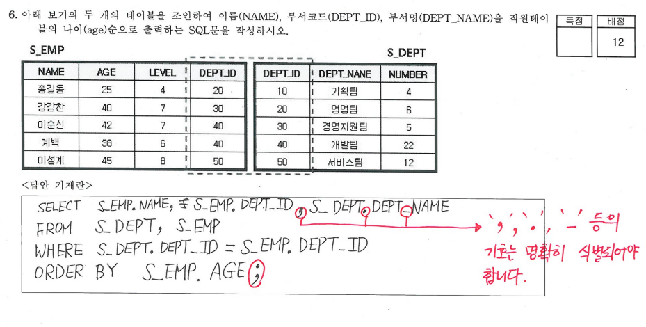데이터베이스 과목은 데이터베이스의 이해와 사용법에 관련된 문제가 출제됩니다. 데이터베이스의 이해 부분에서는 관계 대수식을 이용한 표현 방법이나 상단 이미지와 코드처럼 관계형 데이터베이스에서 필요한 자료를 가져오기 위해 필요한 query문 작성 문제가 출제됩니다.