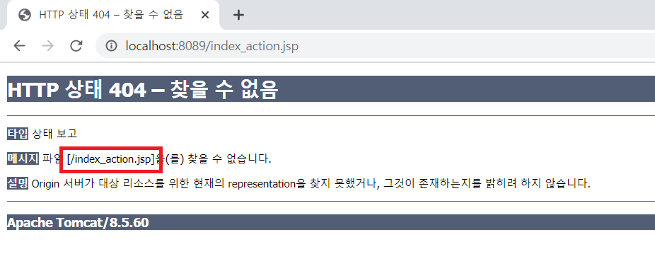 form 태그의 action 속성에 "index_action.jsp" 를 경로로 지정했는데 이동할 페이지가 없어서 오류가 발생합니다.
