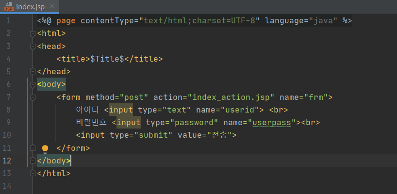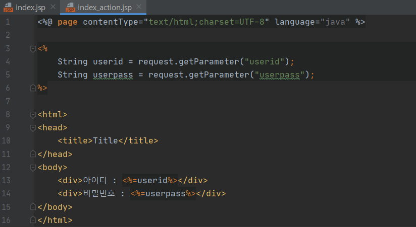 JSP 기본 태그인 스크립트릿(<% %>)을 이용하여 index.jsp에서 값을 받아옵니다.