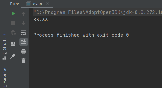 이것을 다시 double 타입의 숫자 100으로 나누면 소수점 둘째 자리까지 83.33이 출력됩니다.