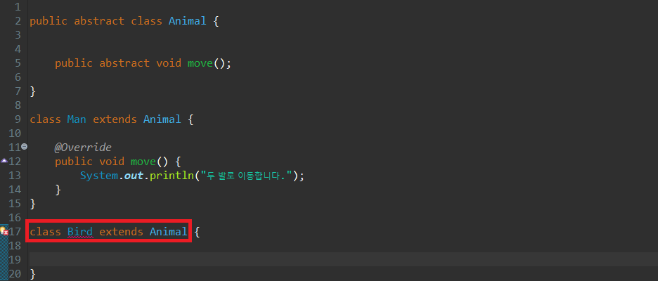 추상 클래스를 상속받은 클래스는 부모 클래스가 갖고 있는 추상 메소드를 받드시 오버라이딩 해야 합니다. 그렇지 않으면 위의 이미지 17번째 줄처럼 클래스명에 빨간줄이 생기면서 오류가 발생하는 것을 확인할 수 있습니다.