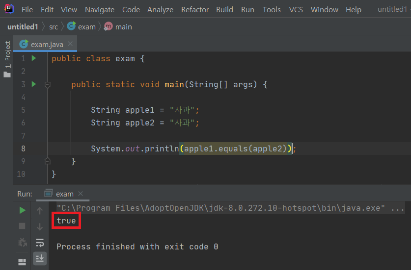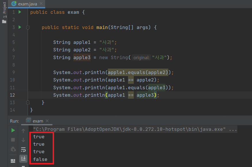 equals는 두 객체의 내용을 비교합니다. 둘 다 "사과" 라는 값을 가리키고 있기 때문에 결과는 true가 출력됩니다.