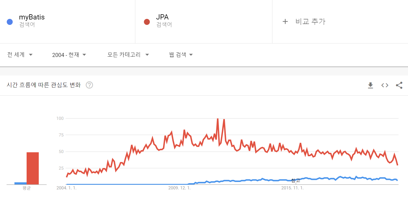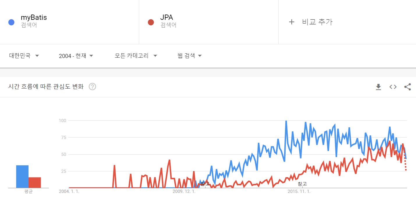 구글 트렌드에서 검색한 myBatis와 JPA의 조회량을 비교하면 국내에서는 지난 10년간 myBatis가 압도적이었으나 최근에는 비슷한 양상을 보이고 있다.