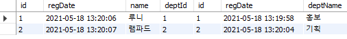 select emp.id, emp.regDate, emp.name, dept.deptName from emp inner join dept on emp.deptId = dept.id;